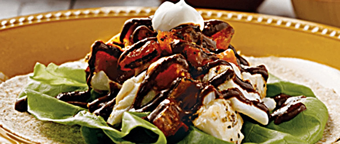 Top with 2 tablespoons molé sauce and 1 heaping tablespoon crema.