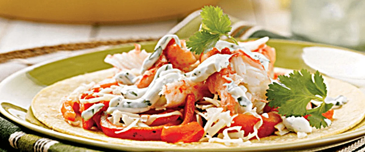 To serve, divide red pepper strips, cheese and crabmeat between tortillas.