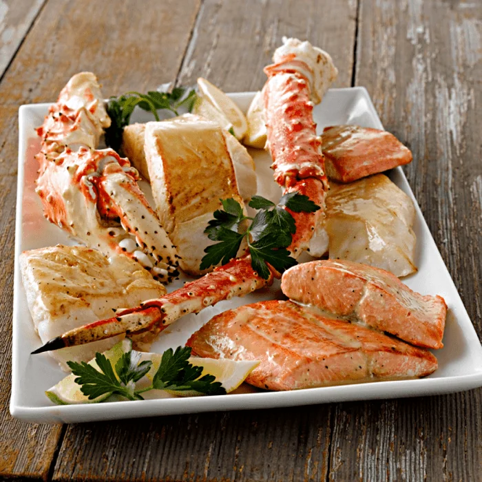 Vacuum-packed and individually sealed fillets and crab sections and legs.